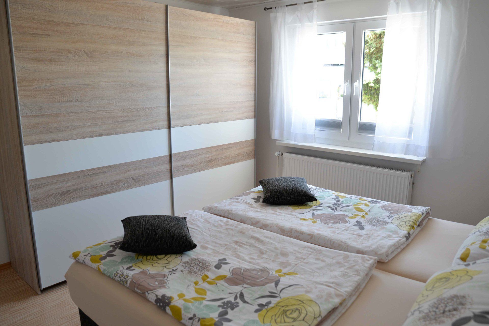 Das ruhige Schlafzimmer ist ausgestattet mit einem Doppelbett und Kleiderschrank.